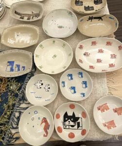 写真はお皿ばかりですが、カップもあります。いろんなアイテムに会場で合ってください。