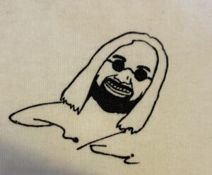 この絵はGokiさんの似顔絵です。松岡さんが描きました。よく似ている。ね、Yhojiさんみたいでしょ。2年ほど前にカットソーにプリントして売り出しました。松岡さんもモード学園でファッションを学んだ人です。卒業後はアパレルメーカーの営業で経営手腕を磨いてきたのでGoki社を立ち上げ運営できたのですね。