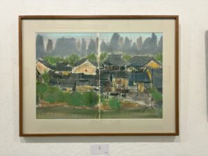 「街桂林」のスケッチでは集落の向こうに桂林独特の山々が見えています。