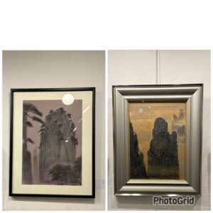 この2点は黄山のスケッチ(左)と本画(右)です。全く同じ場所ではありませんがどちらも黄山の部分です。お願いを聞いてくださったからの展示です。